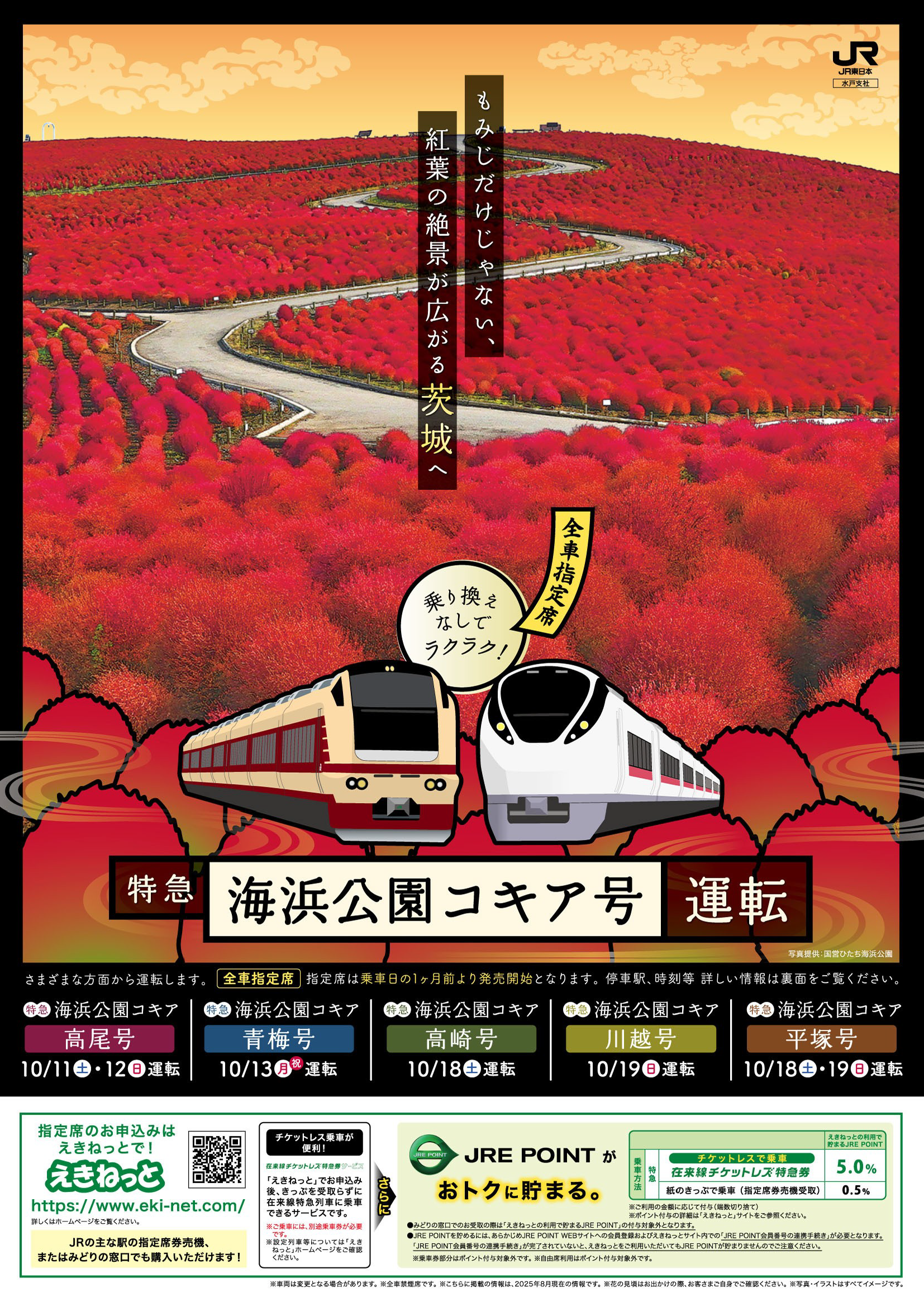 毎年多くのお客様が足を運ばれる『国営ひたち海浜公園』ですが、JR東日本では、コキアの見ごろの時期に合わせて首都圏5方面からの直通臨時列車が運行されます。